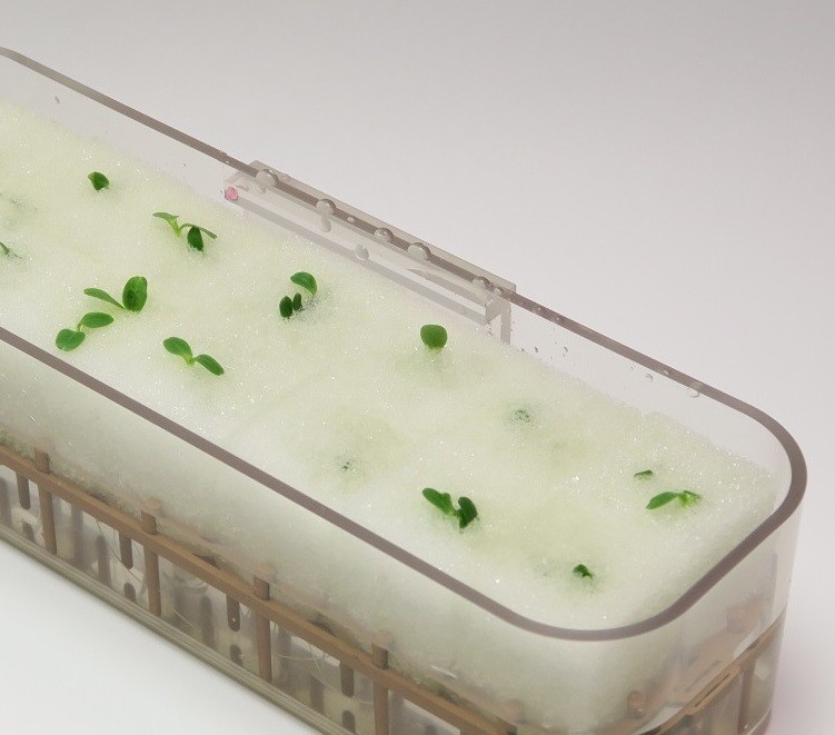 リビングファーム水耕栽培の特許構造の育苗トレイにのった培地から根が真っ直ぐに伸びます.